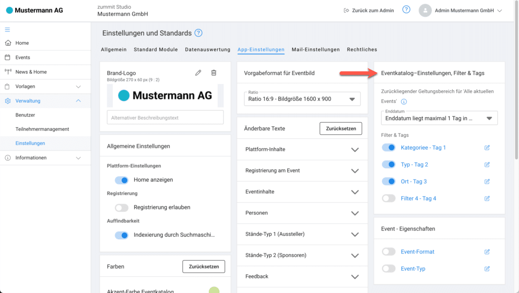Hier befindet sich die Kachel „Eventkatalog-Einstellungen, Filter & Tags“, in der die Filter konfiguriert werden können.
