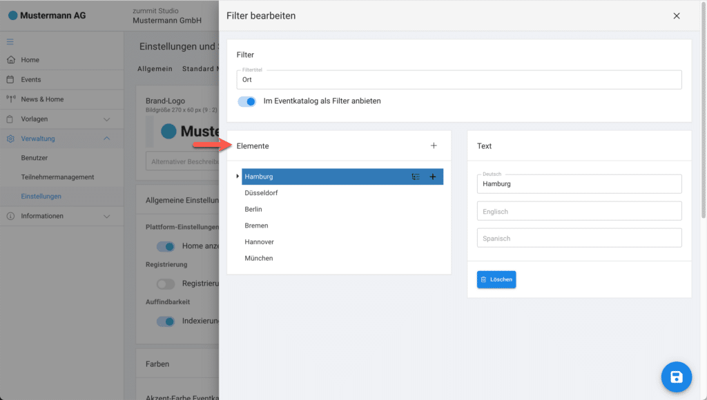 - Das Element in mindestens einer der verfügbaren Sprachen (Deutsch, Englisch, Spanisch) benennen.