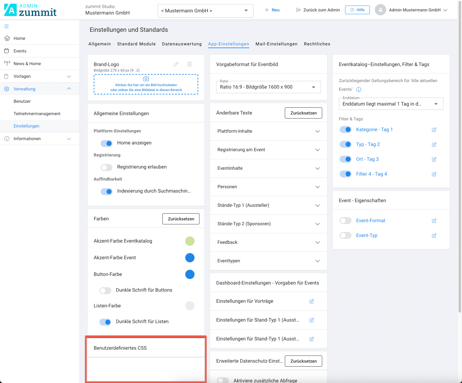 Die Möglichkeit, das Erscheinungsbild Ihrer Event-Plattform anzupassen, finden Sie in den App-Einstellungen innerhalb des Verwaltungsbereichs. Diese Einstellungen bieten Ihnen die Werkzeuge, um eine nahtlose und kohärente Markenidentität über alle Ihre digitalen Touchpoints zu gewährleisten.