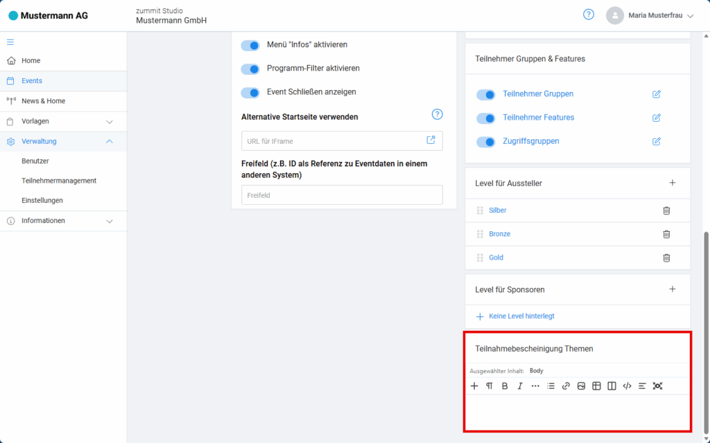 Dort steht Ihnen der HTML-Editor zur Verfügung. Das Layout für Teilnahmebescheinigungen erstellen Sie ganz einfach im Editor. Dieser funktioniert genauso wie der Editor für Mailings, Mitteilungen und Eventbeschreibungen. Sie können dort Ihren Text eingeben und nach Wunsch gestalten.
