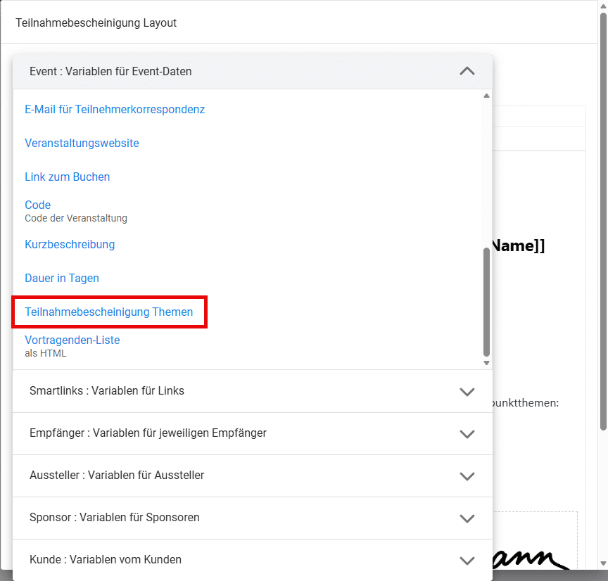 - Wählen Sie aus dem Drop-Down-Menü im Editor die Variable „Teilnahmebescheinigung Themen“ aus der Variablenliste aus.