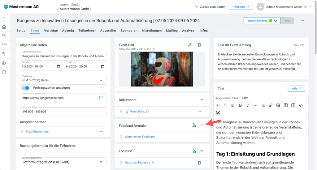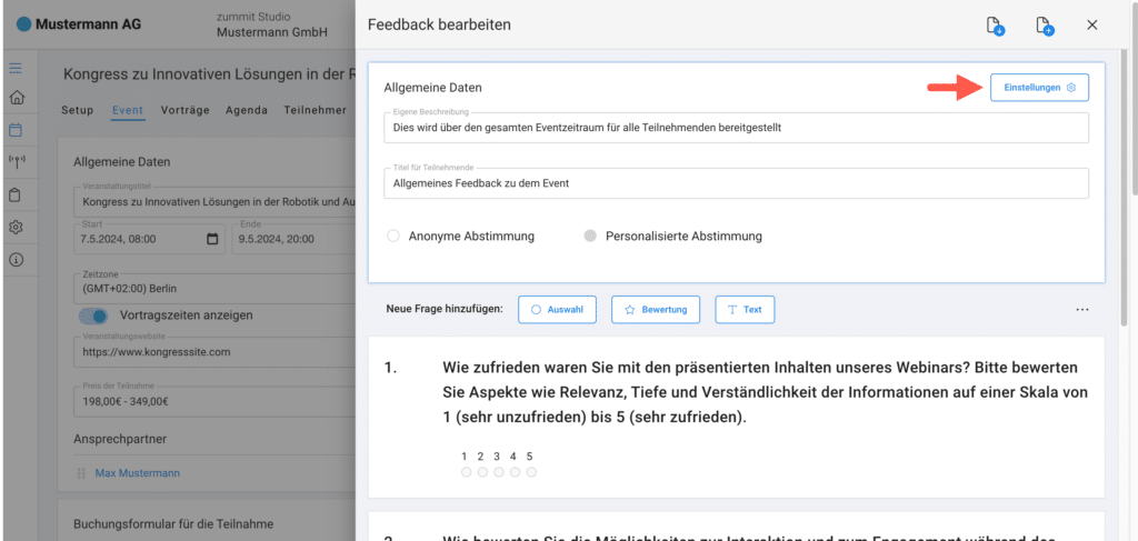 - Navigieren Sie zu dem Bereich (Event, Vortrag oder Stand-Typ), in dem Sie das Feedbackformular hinzufügen möchten.