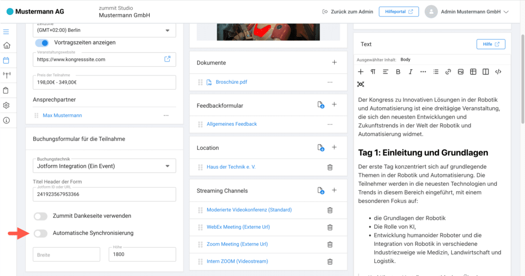 Stellen Sie ein, ob die Datenübertragung von Jotform zu zummit automatisch oder manuell per Knopfdruck erfolgen soll. Diese Funktion wird als automatische Synchronisierung bezeichnet und kann je nach Ihren Präferenzen aktiviert oder deaktiviert werden.