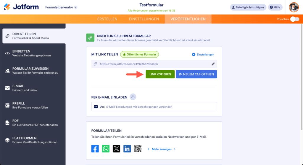 Um den Formularlink in Zummit einzufügen, gehen Sie wie folgt vor: Klicken Sie in JotForm auf „Veröffentlichen“, um den Link zu Ihrem Formular zu kopieren. Wechseln Sie dann zur Zummit-Plattform und fügen Sie den kopierten Link unter der JotForm-Integration ein. Damit wird Ihr Formular erfolgreich mit zummit verknüpft.
