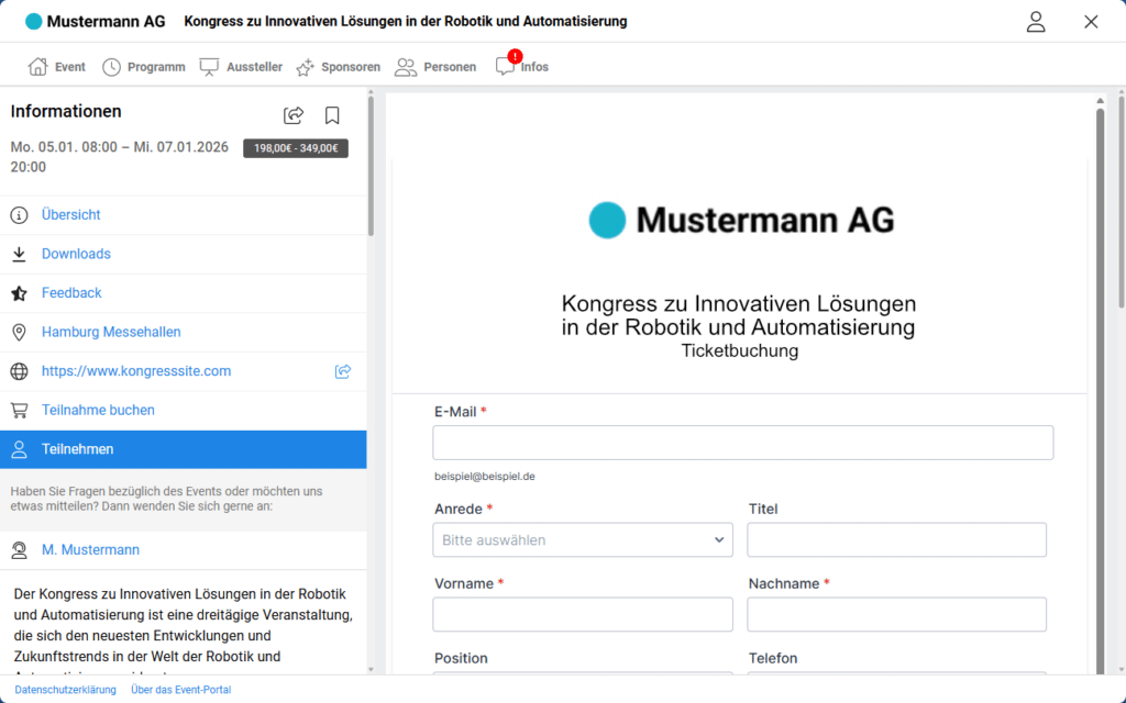- Flexibilität und Anpassungsfähigkeit: Passen Sie Ihre Anmeldeformulare genau an die spezifischen Anforderungen Ihrer Veranstaltung an. Egal ob Konferenz, Seminarreihe oder Messe – Sie haben die volle Kontrolle über die abgefragten Teilnehmerdaten.